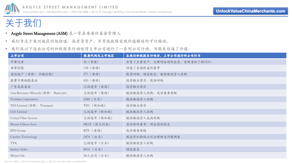 事情始于今年1月,一家名为Argyle Street Management简称“ASM”的对冲基金,披露持有公司6%的股份,为第三大股东。向招商局中国基金提出对于股东及管理人双赢的方案,建议管理层向股东们释放价值。