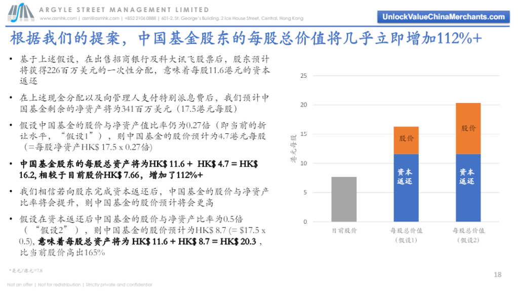 按23年报价值计算,招行和科大讯飞约可变现16.5亿港元。以A股的流动性,招商局基金可以在几天内轻松按市价出售这些股票。ASM认可招行和科大讯飞为基金带来了超额收益,但股东若有意投资招行和科大讯飞,可以自己在市场上购买,无需通过流动性较低的招商局中国基金来间接投资这两家公司。